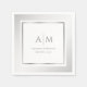 Des serviettes en papier mariage minimalistes, mais élégantes et monogrammées, avec un cadre en argent entourant tous les détails importants de l'événement. Ces serviettes en argent peuvent être facilement personnalisées à un mariage, 25e anniversaire de mariage, ou une fête d'anniversaire, par exemple.