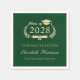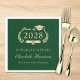 Serviettes élégantes de soirée verte et or avec "Classe de" dans une couronne de laurier avec un casquette diplômé et diplôme, le nom du diplômé dans un script formel, et "Félicitations" et leur nom d'école dans la typographie classique.