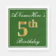 Cette conception simple et élégante de serviette en papier comporte un message comme "AnameHere’s 5th Birthday" (avec le "5th" ayant une fausse couleur dorée) dans une zone carré de couleur verte avec un contour de bordure simple. Le nom est dans un texte de type script de couleur blanche, et peut être customisé. Des serviettes comme celles-ci pourraient être utilisées à une fête d'anniversaire pour quelqu'un qui célèbre son cinquième anniversaire. [~Z0000137]