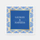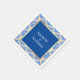 Serviettes en papier de mariage élégantes avec une bordure en faux or contre un arrière - plan damassé bleu et beige.