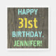 Ce design amusant de serviette de fête d'anniversaire comporte un message comme "HAPPY 31st BANTHDAY, JENNIFER!", où le nom peut être personnalisé. L'arrière - plan présente un motif rustique, brun, imitation bois de grain. Le texte du message personnalisable est composé de couleurs comme le bleu, le jaune et le vert, et il a un aspect inspiré de celui du lettrage peint et recouvert de pochoirs. Des serviettes comme celles-ci pourraient peut-être être utilisées à une fête d'anniversaire pour quelqu'un qui célèbre son trente et unième anniversaire. [~Z0000292]
