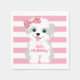 Des serviettes pour coordonner avec mon invitation à la fête d'anniversaire de la chienne. Un arc à pois complique l'arrière - plan rayé rose et le chiot mignon dans cette adorable ligne de fête d'anniversaire de chiot.