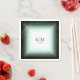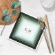 Un arrière - plan d'aquarelle dans les tons vert émeraude est surmonté d'une abstraite de lignes dorées fines et d'effets lumineux scintillants pour créer les pièces de cette belle suite mariage. La serviette en papier mariage présentée ici présente également un cadre incliné et doré pour tenir les initiales de la mariée et du marié et la date du mariage. Recherchez ID867 pour voir d'autres pièces et choix de couleurs pour cet ensemble.