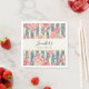 Serviettes en papier avec un beau motif représentant de jolies fleurs roses superposées sur un motif rayé composé de bandes bleues et crème.