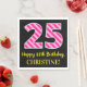 Ce design amusant sur le thème de l'anniversaire de la serviette en papier dispose d'un grand nombre "25", avec un motif de rayures rose clair et rose foncé. Il comporte également le message "Joyeux 25e anniversaire", et un nom personnalisable. L'arrière - plan est noir de couleur. Des serviettes en papier sur le thème de l’anniversaire comme celle-ci pourraient être utilisées lors d’une fête célébrant le 25e anniversaire de quelqu’un. [~Z0000380]