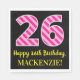 Cette conception amusante de serviette en papier sur le thème de l'anniversaire comporte un grand numéro "26" avec un motif rose clair et rose foncé rayures, avec le message "Joyeux 26e anniversaire", et un nom personnalisé. L'arrière - plan est noir de couleur. Des serviettes en papier personnalisées et amusantes comme celle-ci pourraient être utilisées lors d’une fête d’anniversaire qui se tient en l’honneur du 26e anniversaire de quelqu’un. [~Z0000380]