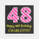 Cette conception amusante de serviette en papier sur le thème de l'anniversaire comporte un grand numéro "48" avec un motif rose clair et rose foncé rayures, avec le message "Happy 48th Birthday,", et un nom personnalisé. L'arrière - plan est noir de couleur. Des serviettes en papier sur le thème de l’anniversaire amusantes et personnalisées comme celle-ci pourraient être utilisées à la fête du 48e anniversaire de quelqu’un. [~Z0000380]