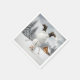 A whimsical snowman stands upside down with boots on its head as snow gently falls, revealing a cozy cabin in the snowy background