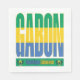 Le drapeau national du Gabon est insufflé au nom du pays. Sous cette image se trouve le nom du pays tel qu'il est connu à l'échelle nationale, et de chaque côté du nom sont deux armoiries nationales.