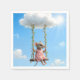 A cute girl mouse in a pink dress swings from a cloud suspended by flower-adorned ropes against a bright blue sky filled with fluffy clouds and a shining sun