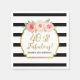 Des serviettes pour la fête du 40e anniversaire avec rayures noires et blanches, texte or et fleurs d'aquarelle rose.