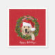 Chien d'or en couronne de Noël avec cordes lumineuses et flocons de neige sur rouge. L'arrière - plan rouge peut être changé.
