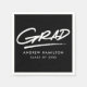 Serviettes modernes de graduation avec "Grad" affichées en lettres manuscrites blanches avec un arrière - plan noir. Personnalisez les serviettes de fin d'études en noir et blanc en ajoutant le nom du diplômé et son année de diplôme. Les serviettes de remise de diplômes personnalisées sont parfaites pour les fêtes de fin d'études secondaires et collégiales.