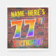 L'avant de ce design de serviette en papier animé, excitant et amusant sur le thème de l'anniversaire est un nom personnalisé, et le message "77E ANNIVERSAIRE !" avec des lettres ayant un motif multicolore inspiré du spectre arc-en-ciel, sur un arrière - plan motif inspiré par un mur de briques. Le style s'inspire de celui des graffitis ou de l'art de rue dessinés sur un mur. Des serviettes en papier amusantes comme celle-ci pourraient être utilisées à une fête d'anniversaire pour quelqu'un qui célèbre son soixante-dix-septième anniversaire. [~Z0000367]