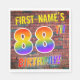 Le devant de cette conception amusante, vibrante et passionnante de serviette en papier à thème d'anniversaire comporte un nom personnalisé, et le message "88E ANNIVERSAIRE !" avec des lettres ayant un motif multicolore inspiré du spectre arc-en-ciel, sur un arrière - plan motif inspiré de murs de briques. L'aspect s'inspire de celui des graffitis ou de l'art de rue dessinés sur un mur. Des serviettes en papier amusantes comme celle-ci pourraient être utilisées lors d’une fête d’anniversaire pour commémorer le quatre-vingt-huitième anniversaire de quelqu’un. [~Z0000367]