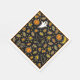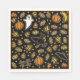 Fun Halloween party napkins featuring ghost, trick-or-treat candy, witch, spider, bat, autumn leaves and orange pumpkins pattern on a black background.