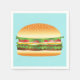 Cette serviette présente une délicieuse illustration de dessin animé d'un hamburger. Le hamburger est fait de viande, laitue verte, tomates rouges, oignon, tranche de fromage et quelques cornichons. Le petit pain a l'air frais et il y a des graines de sésame sur le dessus.