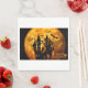 Ce design présente un joyeux accueil d'Halloween avec une image de pleine lune éclairée dans une éffrayante nuance d'orange vif. Vous pouvez aussi voir une maison hantée et des chauves-souris voler en l'air. A côté du texte se trouvent deux petites images : une d'un chat et une autre d'un citrouille, toutes deux associées à Halloween.