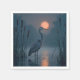 Un héron gris se dresse gracieusement dans une eau peu profonde entourée de hautes roseaux tandis que la lune rose jette une lumière chaude à travers la scène