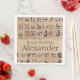 Cette serviette de soirée personnalisée présente un thème artistique égyptien ancien. Une série d'hiéroglyphes égyptiens sont imprimés sur un papier parchemin arrière - plan. Un exemple de message et de nom Joyeux pour l'anniversaire sont imprimés au centre sur un beige sablonneux assorti.