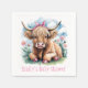 Illustration de charme d'aquarelle d'une vache Highland, ornée d'un bandana rose sucré et d'un délicat vernis à ongles rose sur ses sabots. Assis paisiblement dans un terrain herbeux rempli de fleurs sauvages vibrants, l'adorable veau est entouré d'un paysage montagneux serein, d'arbres luxuriants et d'un ciel bleu clair. Cette scène fantaisiste et chaleureuse est parfaite pour célébrer la douche d’une petite fille avec un charme rustique et une élégance campagnarde douce.