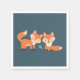 Serviettes en papier avec une illustration graphique de 2 renards oranges à l'air mignon et heureux. Arrière - plan vert foncé.