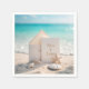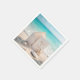 Une carte blanche et une enveloppe reposent sur une plage de sable bordée de coquillages, d'une étoile de mer et d'un arrière - plan océanique turquoise. Tout le texte peut être modifié.
