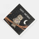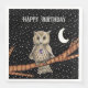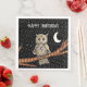 Cette serviette en papier est un ciel nocturne noir avec une lune et des étoiles blanches en croissant et une chouette brune portant un collier de cristal violet assis sur une branche d'arbre. Customisez le texte Joyeux anniversaire avec le modèle.