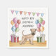 L'illustration originale de Destei d'un mignon chien de race Wheaten Terrier revêtu d'un revêtement souple. Le chien est placé dans un cadre d'anniversaire coloré avec des ballons d'anniversaire de couleur pastel, des cadeaux et une bannière de bunting. Les couleurs pastel sont le rose, le vert, le bleu, le rouge, l'orange et le violet. Le chien est debout sur une texture de plancher de bois jaune et l'arrière - plan a un motif de pois de couleur pastel ludique. Vous trouverez également une zone de texte personnalisable.