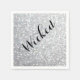 "Wicked" écrit dans un script de ruban fantaisie orne cette serviette brillante argentée, ce qui en fait un endroit parfait pour ajouter un peu de glamour à votre fête d'Halloween.