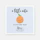 Petite petite cutie thème baby shower papier bleu avec une illustration d'une mandarine feuille orange et verte avec un joli sourire et des joues roses. Le texte dit "un peu mignon est en route !" Idéal pour une douche de garçon.