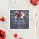 Des serviettes en papier mariage personnalisées et élégantes, dotées d'un bouquet de fleurs de pivoines botaniques rouges bordeaux et blanches, de branches de sapin vert de saison, de baies rouges et de feuillage, sont installées sur un arrière - plan de bois de grange bleu marine foncé et éclairées à la corde. ++++++++++++++++++++++++ Convient pour les mariages hivernaux / Noël, douches nuptiales ou de couple, anniversaires ou autres fêtes saisonnières, réceptions, cocktails.