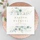 Cette serviette mariage est ornée d'eucalyptus à aquarelle peinte, de feuilles de parties scintillant botanique vert et or avec script or.