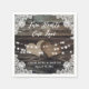 Serviettes en papier mariage campagnard rustique avec deux coeurs de burlap et des lampes à cordes contre un arrière - plan en bois de grange orné de dentelle fleurie blanche.