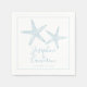 Une serviette de cocktail d'étoiles de mer bleu doux avec des noms de mariés et de mariés personnalisés et un rendez-vous mariage, parfait pour un mariage de plage ou une douche nuptiale célébrant le couple qui aime l'océan.