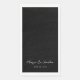 Ces serviettes d'hôtes en papier mariage personnalisées modernes sont dotées d'un script blanc à la main avec des noms de famille et une date de mariage sur un simple arrière - plan noir. Conçu par l'artiste Susan Coffey.