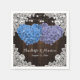 Serviettes en papier mariage romantique violet et bleu avec des coeurs floraux et de la dentelle florale blanche sur un fond en bois de grange. Articles assortis disponibles.