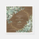 Parfaits pour les mariages à thème nature, ces serviettes en papier botanique couleur aquarelle rustique présentent des bouquets de verdure eucalyptus décorant le cadre géométrique doré autour des noms de la mariée et du marié et de la date mariage, avec un arrière - plan en bois marron rustique.