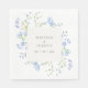 Jolies et élégantes serviettes de mariage avec un cadre carré de fleurs d'aquarelle bleu clair, personnalisées avec vos noms et date mariage dans le centre en gris.