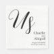 Ces serviettes mariages romantiques et élégantes sont décorées dans un style noir et blanc. Le titre "Us" est imprimé en gros caractères en haut, au-dessus des noms du couple se mariant. Les informations mariages sont imprimées ci-dessous dans une police noire sophistiquée, moderne.