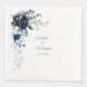 Une élégante serviette d'hôte de mariage avec un bouquet d'une pivoine bleu marine à la végétation bleu poussiéreuse avec vos prénoms et date numérique.