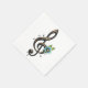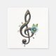 Mechanical clef and flowers to the beat of the clocks. A steampunk-style treble clef, rendered in dark metal with bronze accents and intricate detailing. The clef is adorned with blue flowers that have clock faces at their centers, adding a whimsical touch. Musical notes float near the clef, and small droplets hang from its curves.