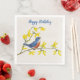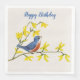 Cette serviette en papier a un mignon oiseau chantant bleu et rouge assis sur une branche avec des fleurs jaunes vibrantes sur un arrière - plan blanc. Customisez le texte Joyeux anniversaire avec le modèle.