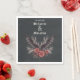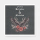 Serviettes mariages sobres et gothiques avec des noms et datées en calligraphie gothique anglaise ancienne - arrière - plan noir de charbon avec une chauve-souris noire à ailes ouvertes et spray floral séché en bois et noir - facile à customiser modèle - Conçu par WhimsicalArtwork™ pour laBrideBarefoot ™.