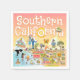 Une scène lumineuse et colorée offre une vue spectaculaire de la Californie du Sud - personnages farfelus sur la plage et le désert de SoCal présentant les parcs de Los Angeles, Orange County, San Diego, Père Noël Barbara, Riverside, Palm Springs, El Centro, Salton Sea, Anza Borrego et Joshua Tree ainsi que les villes frontalières de Tijuana, Tecate et Mexicali. Cette charmante scène a tout - un surfeur pend dix tandis qu'un orque saute de l'eau, des animaux de zoo accueillent les touristes, les amateurs de vin font un toast comme un randonneur est remarqué par un OVNI et bien plus encore...