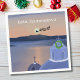 Cette serviette de Noël présente le Père Noël volant au-dessus de Santorin, en grec.