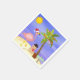 Flamant rose d'été de Noël Plage Vacances adorables Papier Party Napkins présente une jolie scène de Noël d'été plage avec un flamant tropical festif portant un chapeau de Père Noël, lumières de Noël sur un palmier et bonhomme de neige de sable sur la plage. Parfait pour ceux qui fêtent un Noël tropical ou d'été. Conçu par ©Evco Holidays www.zazzle.com/store/evcoholidays