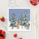 Beaux serviettes en papier avec un thème Forêt Enchantée. Joli petit faon, écureuils et oiseaux dans une forêt de pins enneigés. Le ciel bleu clair au-dessus commence à montrer de beaux flocons de neige tombant au sol. Un vieux panneau en bois indique Joyeux Noël.