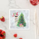 Serviettes en papier avec une drôle d'illustration. Un mignon lama portant des lunettes de soleil noires et un chapeau de santa rouge. Derrière un sapin de Noël avec des cadeaux festifs. Le mot Joy écrit au-dessus de sa tête dans une police de vacances colorée. Arrière - plan de livre d'argent. Design fantasque et amusant à thème de Noël.