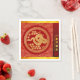 Une représentation élégante d'un serpent doré avec des fleurs formant un cercle (inspirée de la découpe traditionnelle chinoise sur papier) avec un cercle rouge superposé sur un motif asiatique traditionnel rouge et jaune + le graphique "BONNE ANNÉE" en chinois et en anglais et une ancienne calligraphie chinoise pour "serpent" à droite sur une bande de couleur rouge dégradé. Conception sur serviette en papier pour fête. Carte de vœux assortie, carte postale de vacances, carte carrée à plat, carte ronde à plat, carte verticale à plat et plus encore bientôt.